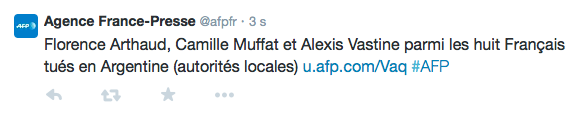 02h12 : l’AFP confirme la mort de Florence Arthaud et Camille Muffat. Le boxeur Alexis Vastine figure aussi parmi les huit Français tués en Argentine, selon les autorités locales. Les cinq autres membres de l’équipe de « Dropped » ont été identifiés par les autorités argentines comme Laurent Sbasnik (réalisateur), Lucie Mei-Dalby (journaliste), Volodia Guinard (journaliste), Brice Guilbert, Edouard Gilles (médecin de la production).