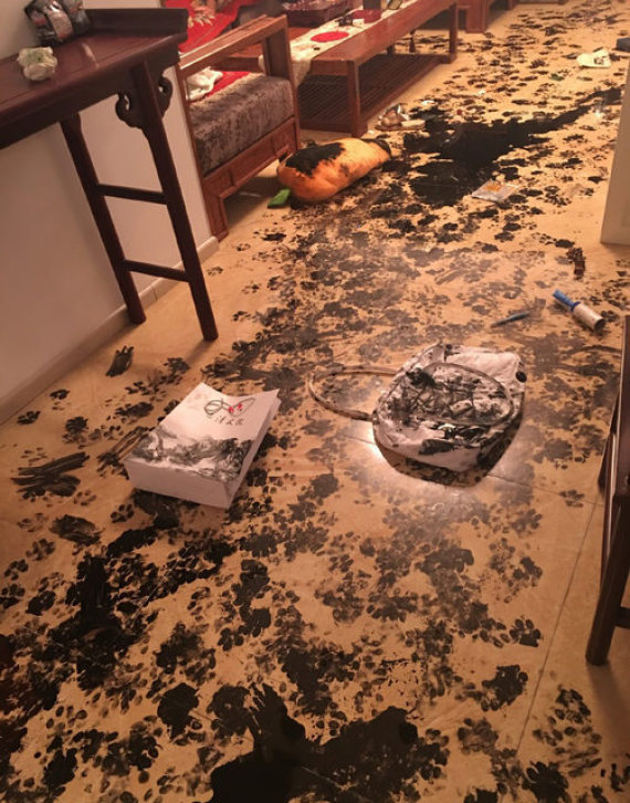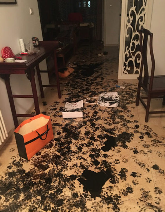 Alors qu’ils s’étaient absentés quelques heures pour se rendre au cinéma, les propriétaires d’un husky ont eu la mauvaise surprise de découvrir leur appartement totalement redécoré. Avant de partir de chez eux, ils ont fait l’erreur de laisser trainer un pot d’encre de chine. La bête s’en est donc donné à coeur joie et en a profité pour repeindre tout l’appartement !