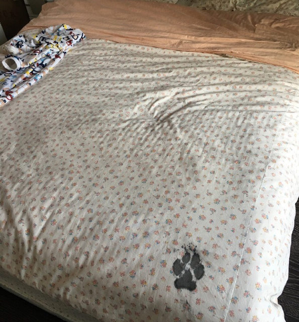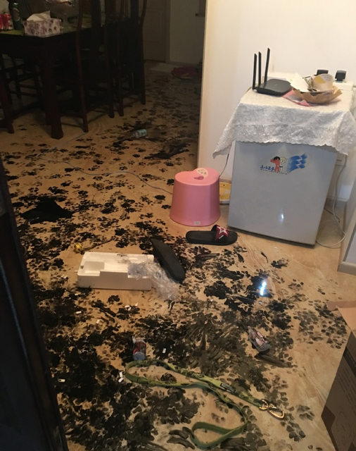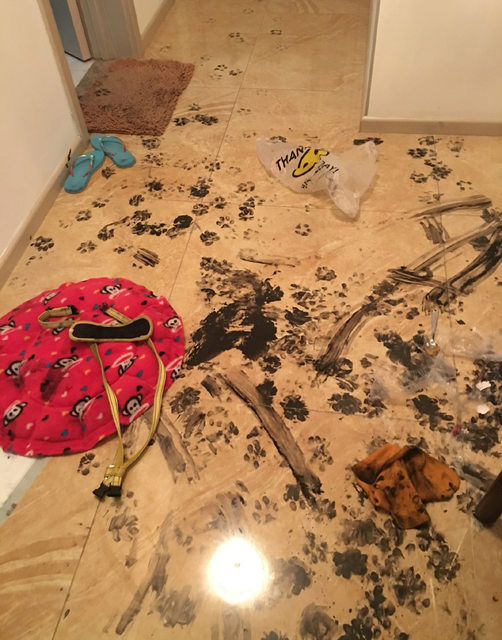 Sol, murs, fauteuils, lit… le gentil toutou n’a rien épargné. Heureusement, après quelques heures de travail, l’appartement a pu être nettoyé et retrouvé un aspect normal. Il cependant fallu reprendre les murs. Chapeau l’artiste !